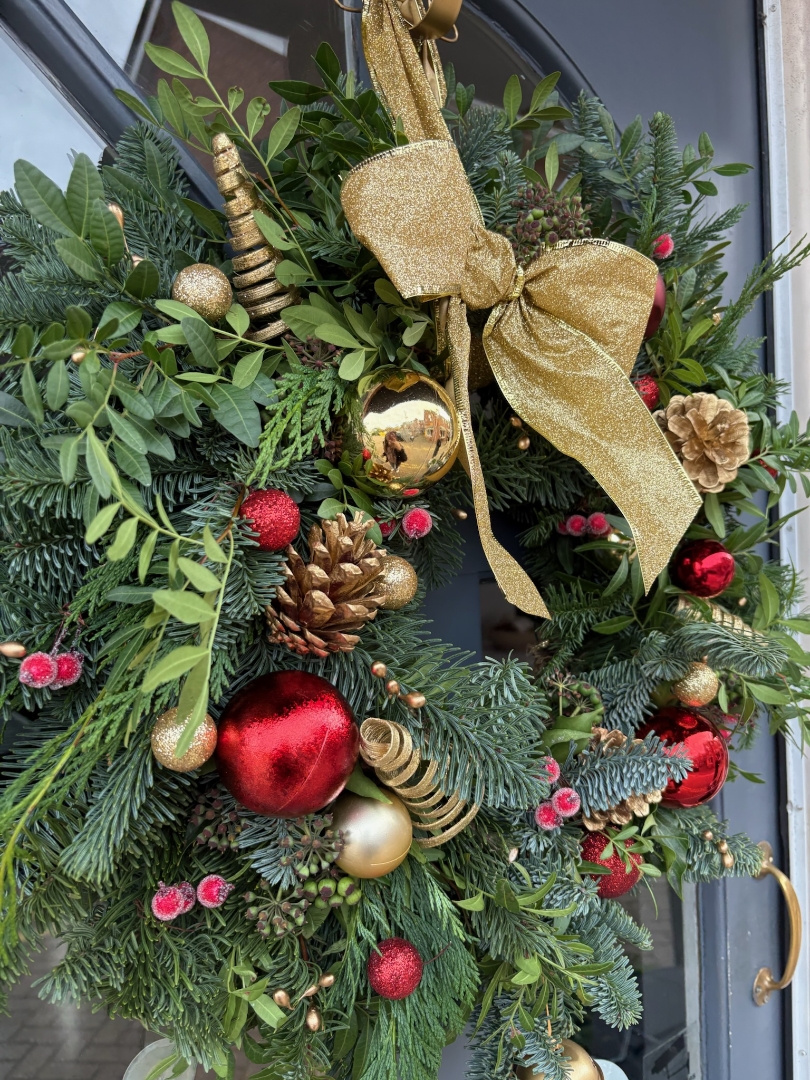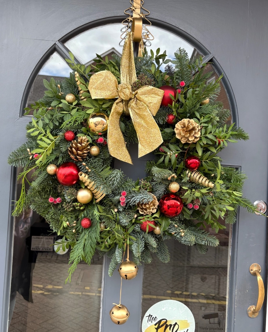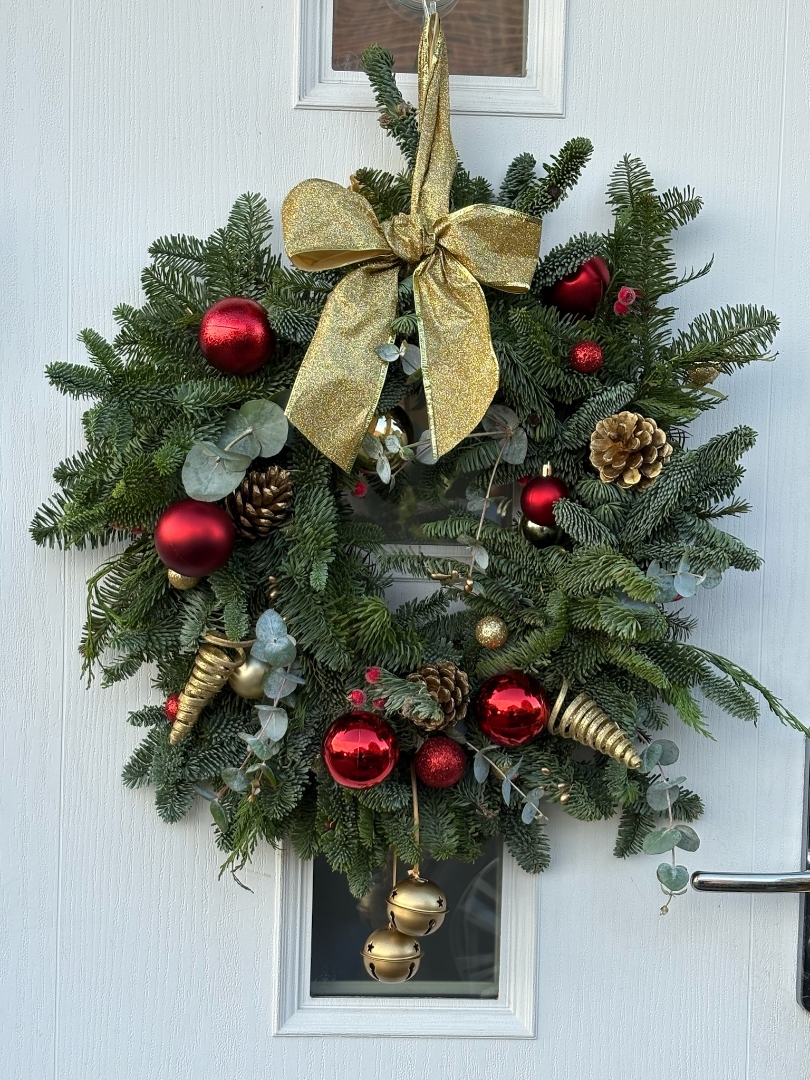 Make a statement this festive season with our Imperial Christmas Wreath , a luxurious blend of classic Christmas charm and elegant sophistication. This wreath features a rich mix of fresh seasonal foliage , adorned with glittering gold baubles, Red berries, Pine Cones and a striking Gold bow for a radiant festive finish.