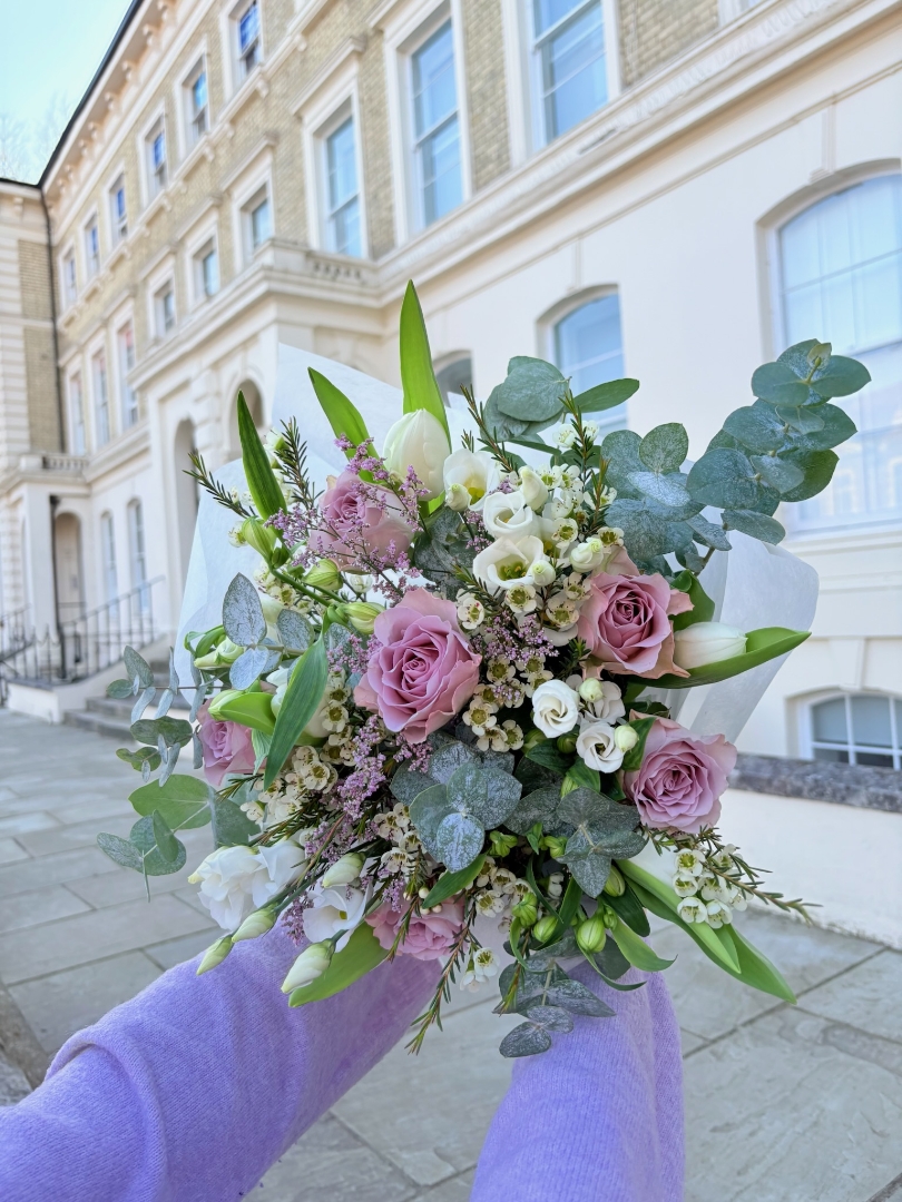 The Delilah bouquet blends soft lilacs and crisp whites for a light, romantic spring feel, perfect for brightening any space. This bouquet is presented in a luxury Gift Box.